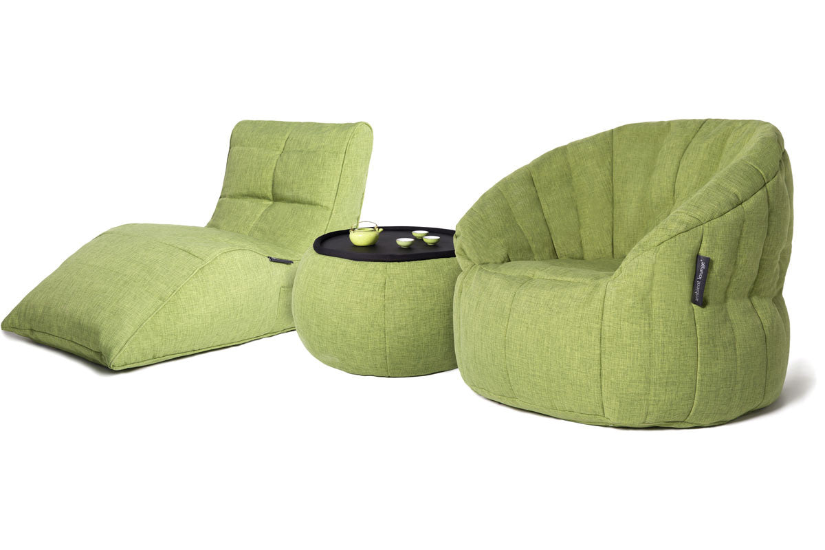 Contrast the rigid lines of your apartment or office with the relaxing curves of our body-moulding loungers! Perfect for living rooms, family rooms, home theatres, games rooms and wine bars, this beautiful chill-out set consists of Avatar Lounger in Lime Citrus, Butterfly Sofa in Lime Citrus and a matching Versa Table. Remove the tabletop and you've got a beautiful footrest and handy spare seat!
